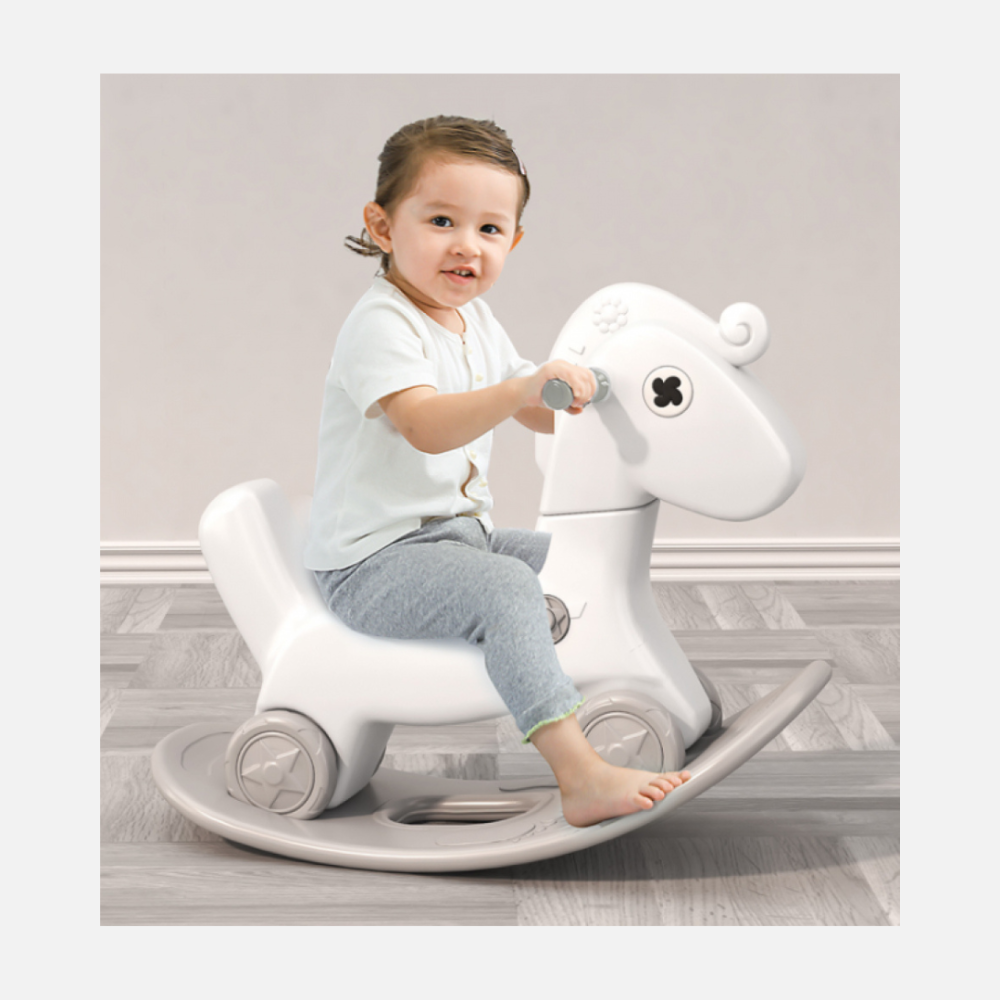 تخيّل ضحكات صغيرك وهو يمتطي حصانه الأبيض السحري، يهتز بخفة وكأنه يخوض مغامرة مليئة بالمرح. عالمه الصغير يصبح أكبر مع كل تأرجح، ومع كل صوت ينطلق، تزداد متعته وحماسته!