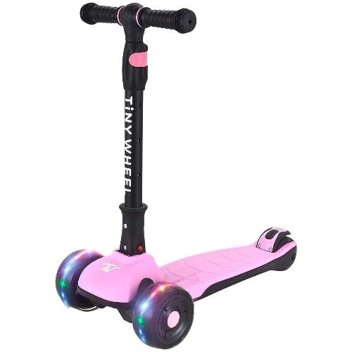 - تايني ويل - سكوتر بنات وردي مع مقود قابل للتعديل، يشتمل على 4 خيارات للارتفاع، يناسب الأطفال من سن عامين وحتى 10 سنوات (حتى وزن 50 كجم).