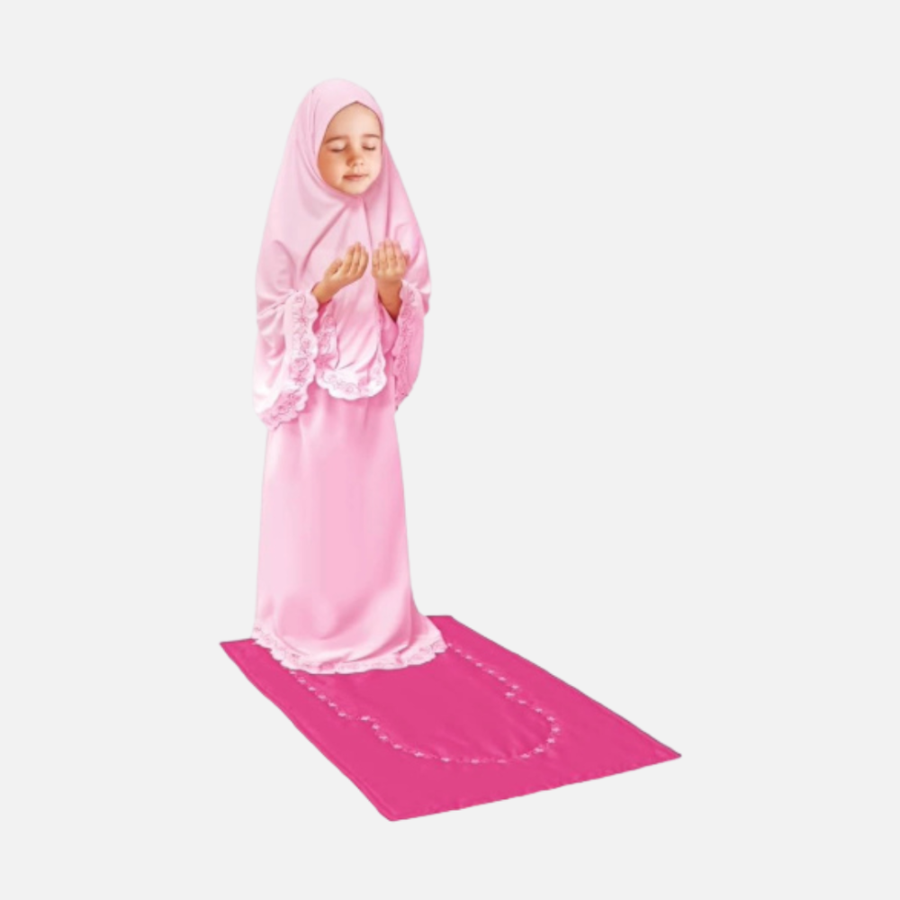 ✨ The Story Begins: In a quiet corner of her room, your little girl stands in front of a pink rug, wearing her small hijab and looking up at the sky with confidence and reassurance. The "Fulla" prayer set is more than just clothing; it's the first step in a beautiful spiritual journey... a journey that begins with one step and continues for a lifetime. 🌙💕