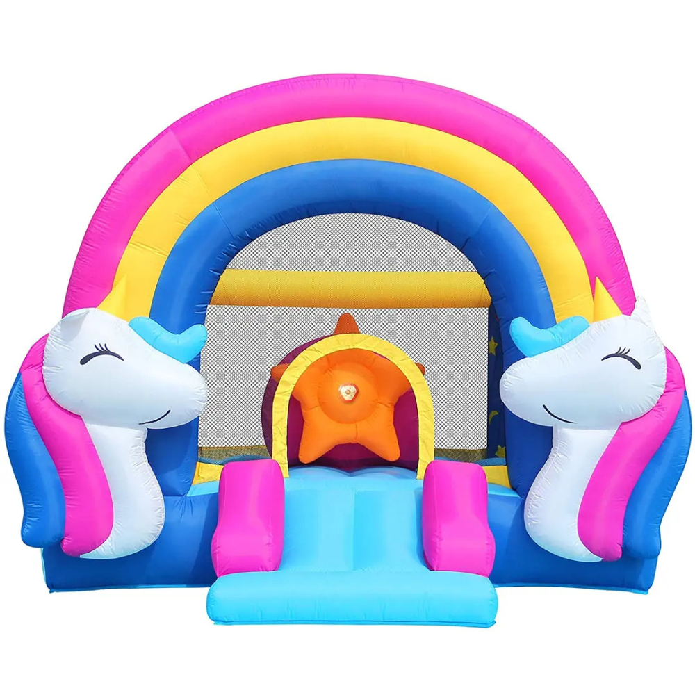 هل تبحث عن تجربة مليئة بالمرح والحماس لأطفالك؟ نقدم لك مدينة الألعاب القابلة للنفخ بتصميم رائع على شكل حصان يونيكورن مع قوس قزح ملون! إنها لعبة مثالية لإضفاء السعادة على أوقات لعب أطفالك، حيث يمكنهم الاستمتاع بالقفز والانزلاق بكل أمان في هذه المدينة المليئة بالمرح.